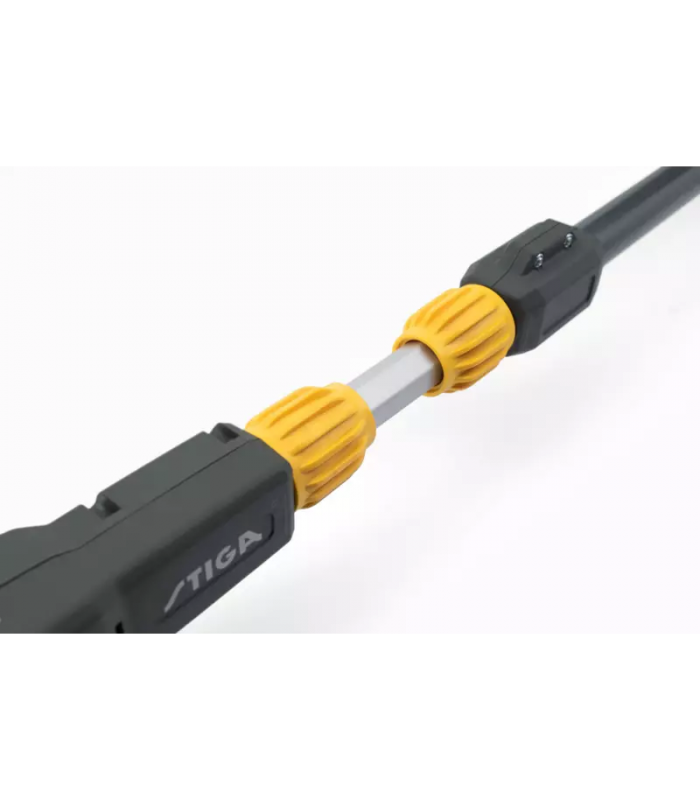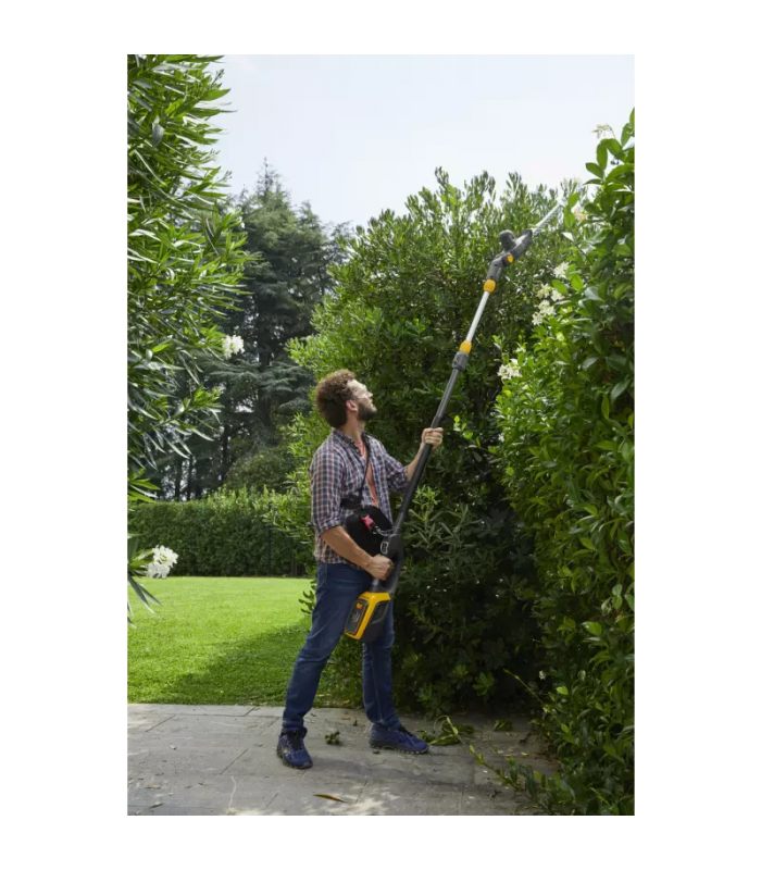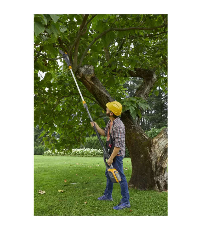 - Teleskopowe przedłużenie do 65 cm osiąga całkowitą długość 2,95 m z sekatorem i 2,7 m z podkrzesywarką