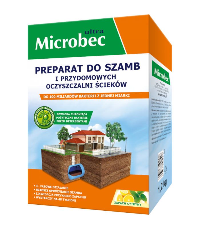 Działanie preparatu: Microbec zawiera wyspecjalizowane kultury bakterii oraz enzymy, które przyspieszają naturalny proces rozkładu resztek organicznych, m.in. nieczystości, tłuszczy, resztek roślinnych, papieru. Obecne w preparacie bakterie ulegają bardzo szybkiemu namnażaniu i już po godzinie od zastosowania ich liczebność w szambie osiąga poziom nawet kilkuset miliardów sztuk. Produkt działa 3-fazowo: zapewnia szybki i skuteczny rozdział zanieczyszczeń, które podlegają upłynnieniu, a następnie enzymatycznemu rozkładowi do całkowicie bezpiecznych i przyjaznych środowisku związków prostych i wody. Pozwala to na oczyszczenie szamba z nagromadzonych osadów i zatorów, zmniejsza częstotliwość opróżniania zbiornika i zapewnia wysoką sprawność działania oczyszczalni. Preparat nie powoduje korozji urządzeń sanitarnych, jest bezpieczny dla ludzi, zwierząt i środowiska.