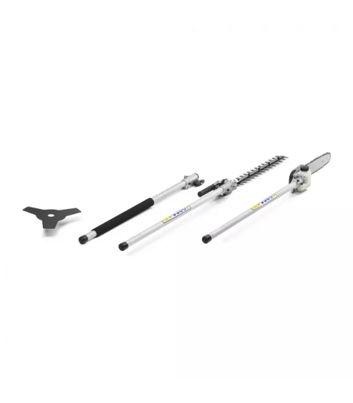 STIGA MT 330 - 5 in 1 to maszyna 5 w 1, której można używać z różnymi narzędziami napędzanymi tym samym silnikiem z zapłonem iskrowym o pojemności 25,4 cm³ i mocy netto 0,7 kW. Może służyć jako kosa z prostym wałem i nylonową głowicą Tap&Go z funkcją szybkiego zwalniania żyłki. 3-zębny nóż ułatwia cięcie najgęstszych krzewów. Nożyce do żywopłotu wymagają zastosowania dodatkowego noża 40 cm i głowic 180°, a listwa 25 cm ułatwia przycinanie. Wszystkich części i akcesoriów można używać z tyczką teleskopową 70 cm dostępną wraz z pojedynczymi szelkami.